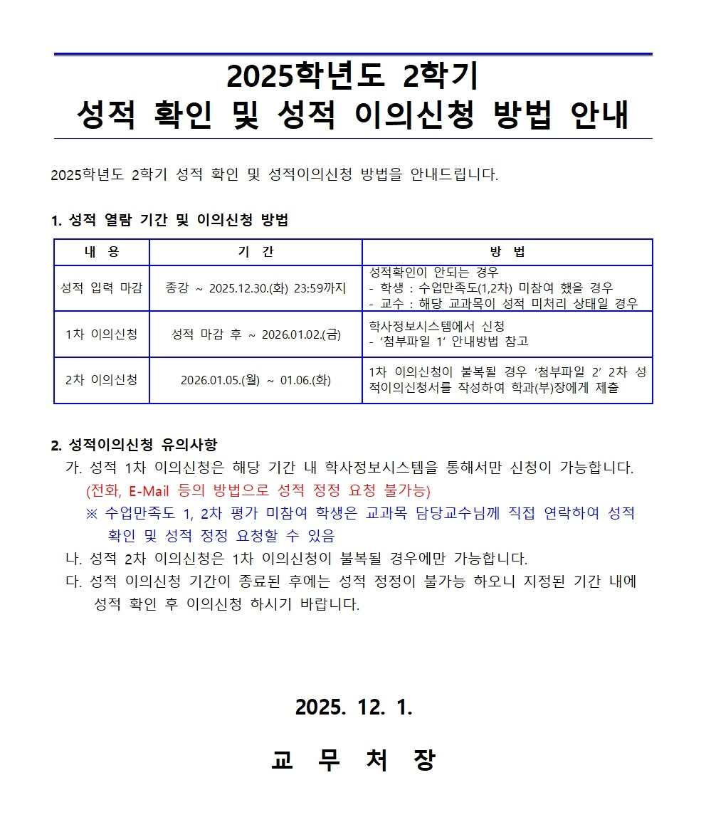 2025학년도 2학기 성적확인 및 성적 이의신청 방법 안내